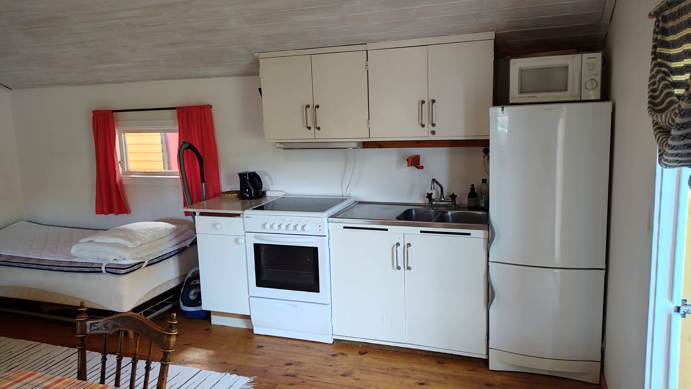 Cabin with one room, 20 m2, with a kitchen unit (no hot water). The cabin is located in the southern part of the village. WC and shower can be found in a shared space about 30 metres from the house. Distance to the sea is about 200 metres.