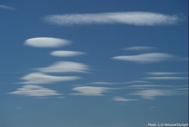 Sometimes pretty altocumulus lenticularis can appear in the sky. They are formed in the shelter of mountain ranges. When the wind blows over the mountains the air can move in waves for several hundreds of kilometres afterwards. In the peaks of the waves altocumulus lenticularis are formed. One condition for the forming of these clouds is a stable atmosphere. Therefore no dramatic weather changes can be expected.