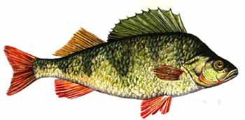 The perch lives in shoals and eats plankton when it is young. When it has grown up it is a predatory fish eating larvae, krill, fry, roach etc. The perch gets to be about 25 centimetres in length and weighs 0.2 - 0.3 kilos. The colour varies a lot depending on the water conditions and to a lesser degree on what it eats. The back is usually dark green and the sides have 5-7 black perpendicular stripes. On the rear end of the front back fin is a dark spot. The fins on the belly and tail are red. The perch is not a picky fish regarding the water but it needs a lot of oxygen and is therefore not often found below 2-3 meters depth. The perch spawns in April through June when the water temperature is 7 - 8°C. The perch is an appreciated and tasty fish that can be caught with most fishing tools.