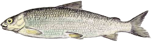 The whitefish belongs to the Salmon Family (Salmonidae). It has an elongated (up to 60 cm) body covered by loose scales and is equipped with an adipose fin. The colour of the back can be grayish, blueish or brownish green. The sides and belly are silver shiny bordering on pink, the fins are greyish, greenish brown or partly reddish brown. The teeth are stunted or missing. The meat is white and tasty.